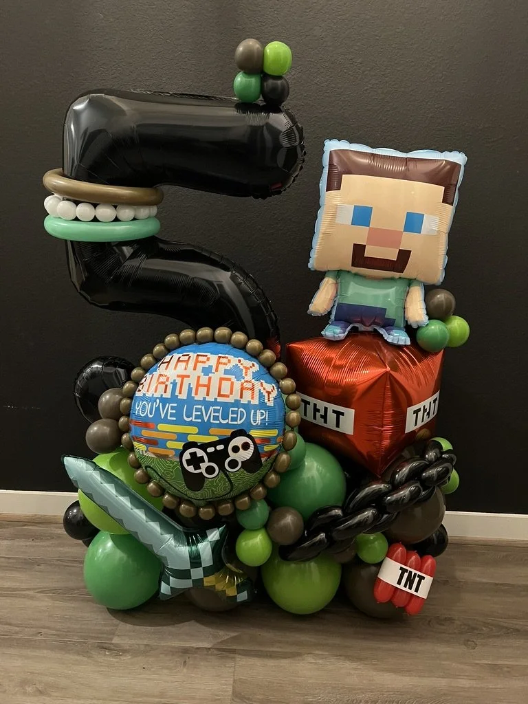 This Minecraft-themed balloon stack was the perfect way to celebrate a gamer turning five! Inspired by the iconic world of blocks and adventure, this design was packed with fun details that brought the theme to life. 🟩🟫