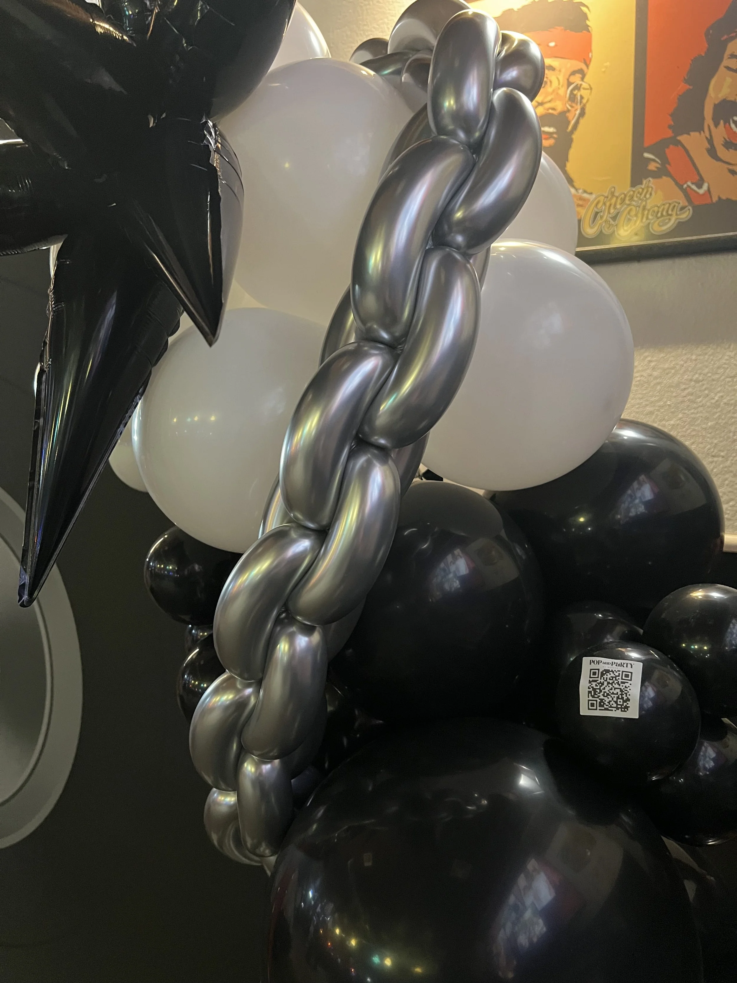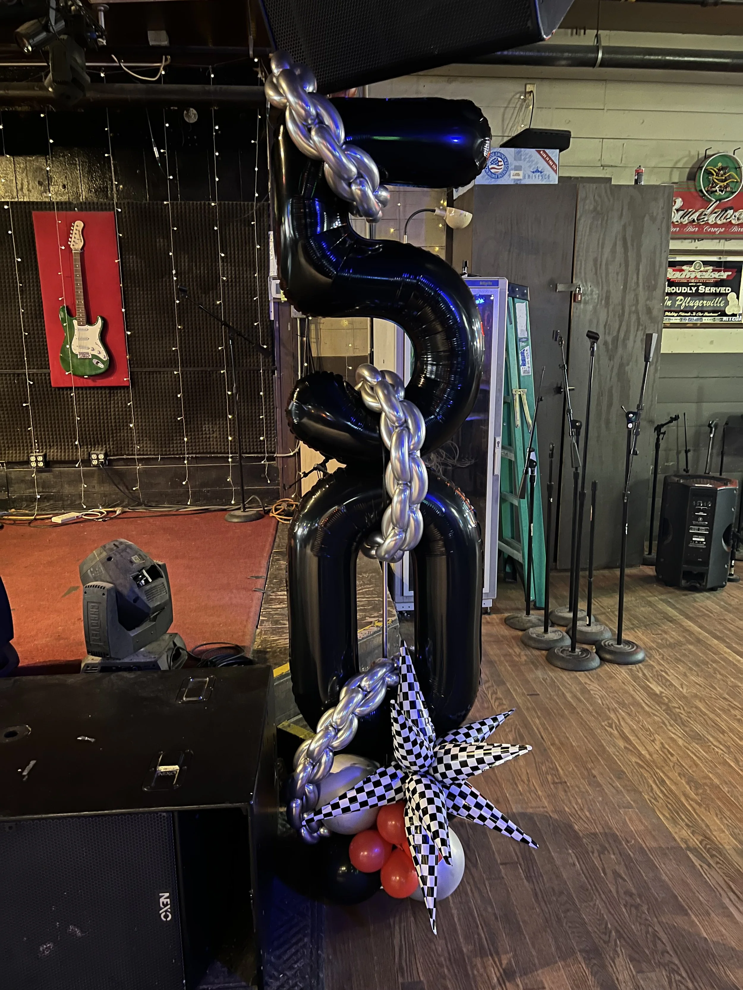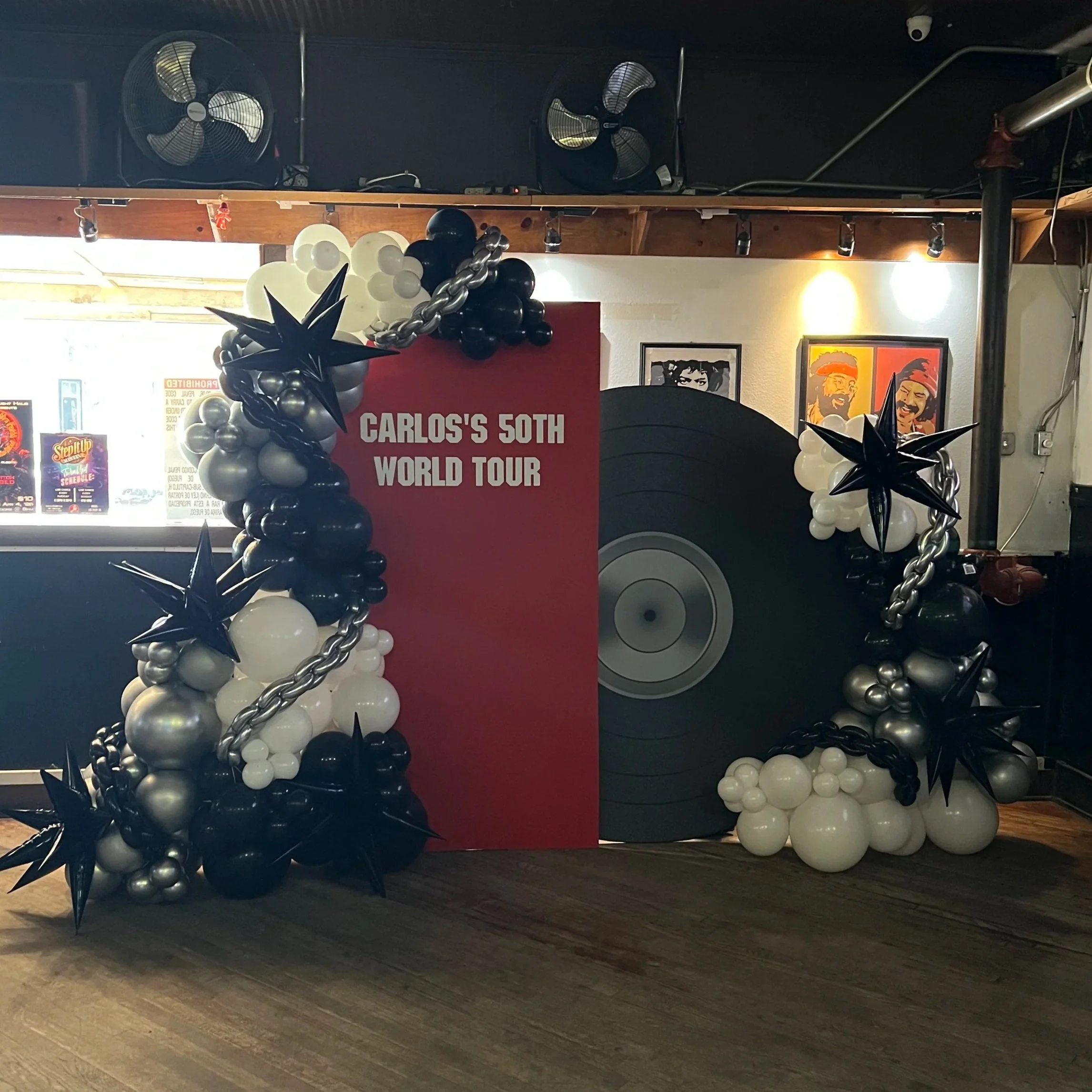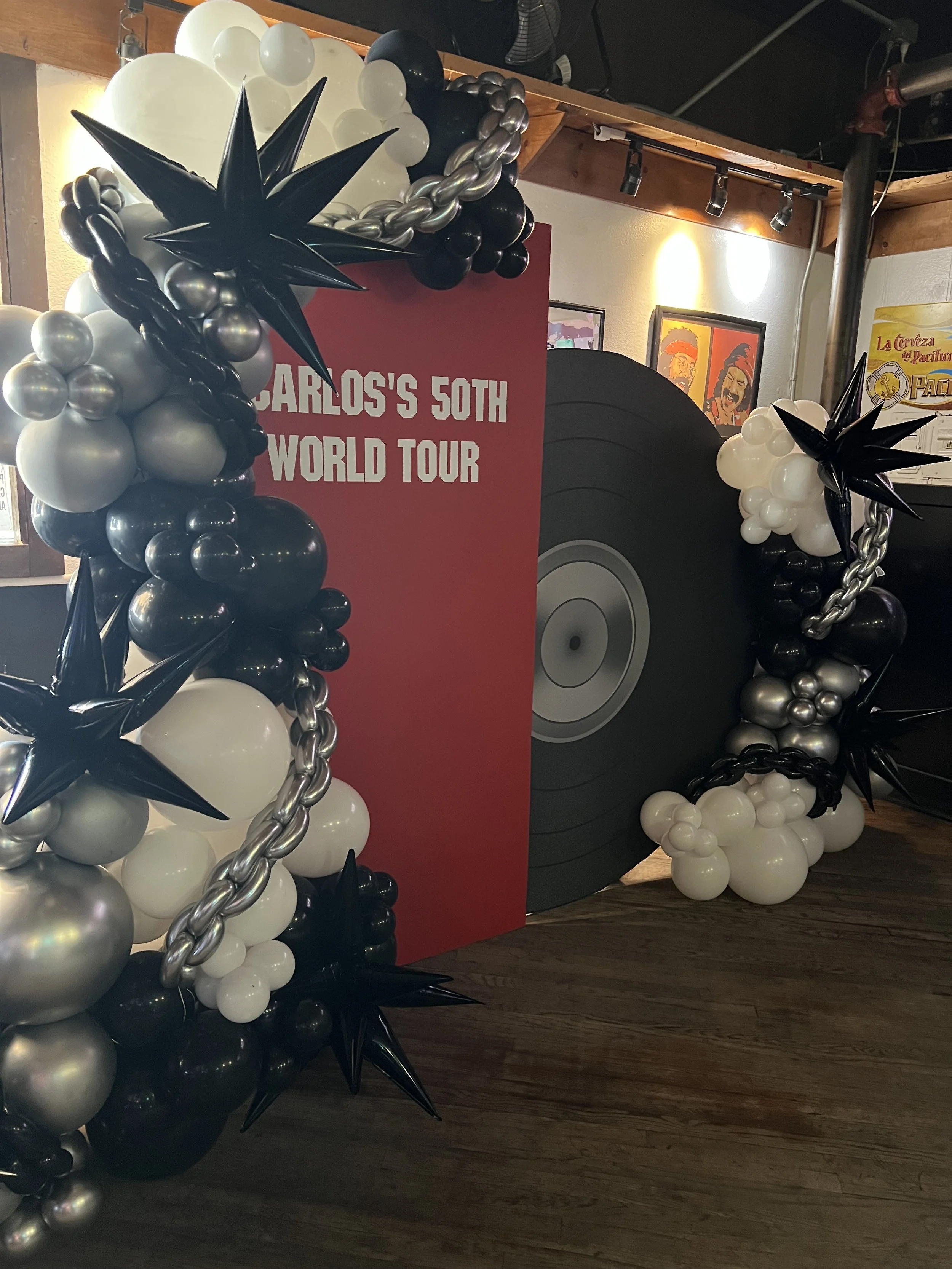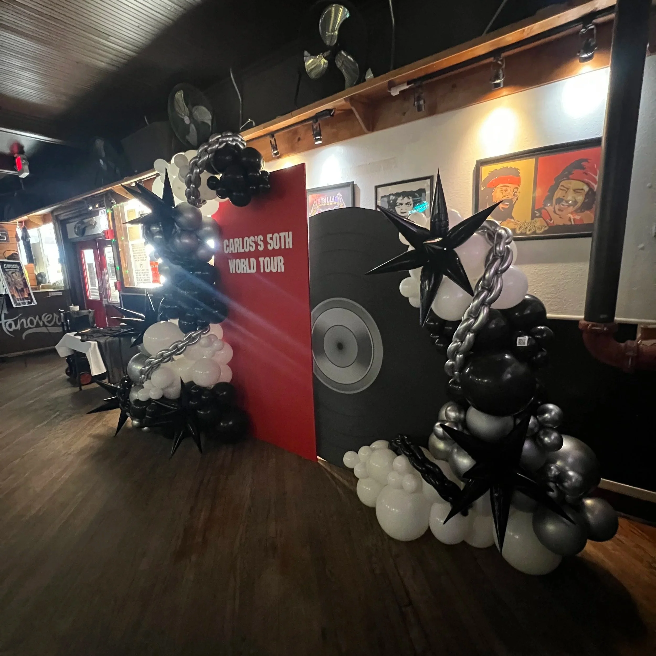 To make the celebration even bigger, we added two “50” number towers decked out with silver balloon chains and checkered starburst balloons, tying in that classic rock aesthetic with a fun, modern twist. 🎈✨