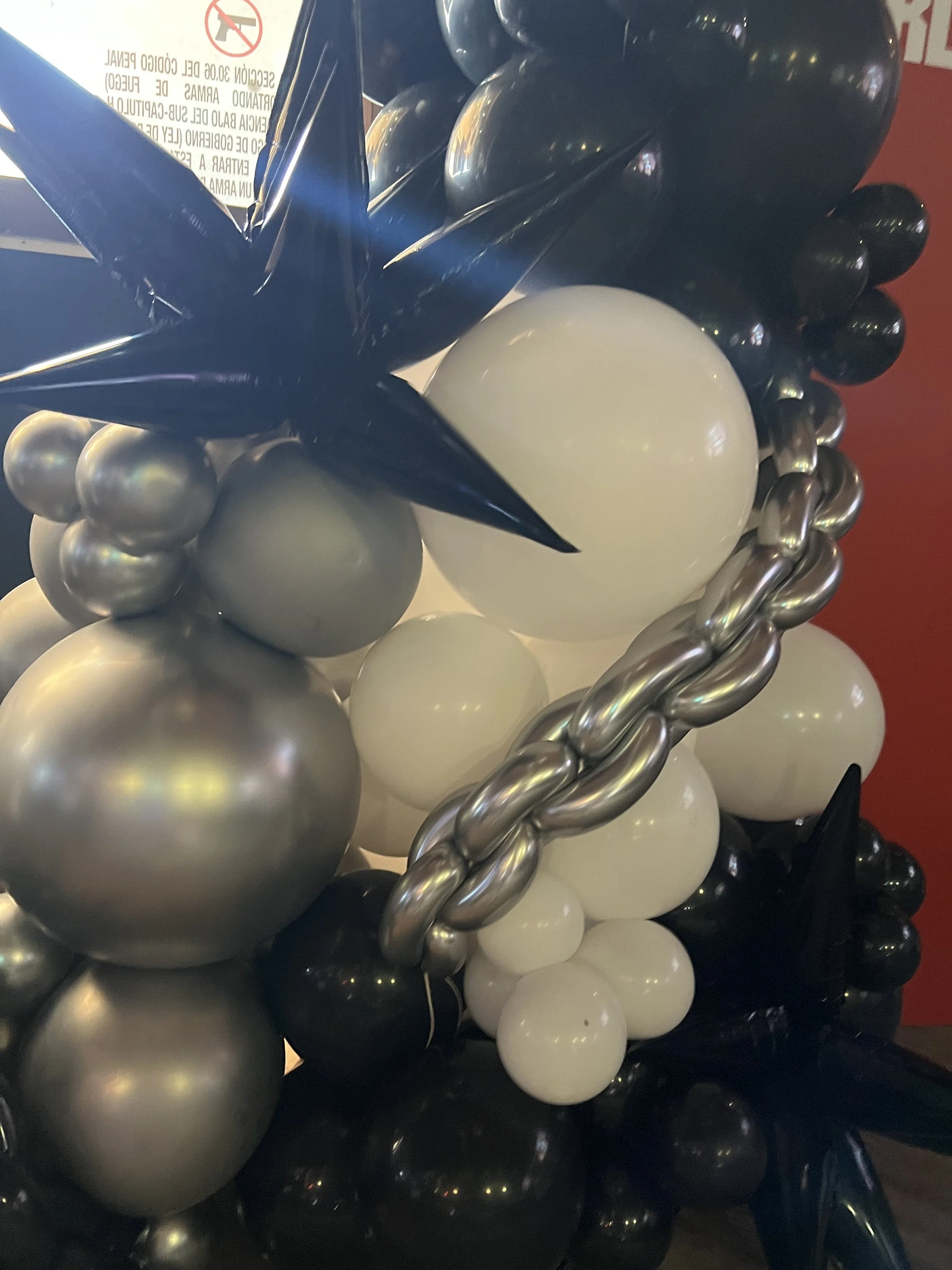 The design featured edgy details like balloon chains and dramatic black starbursts, adding texture, movement, and that perfect rockstar vibe. The main focal point was a 6-foot custom record backdrop, bringing the theme to life and creating an epic spot for photos all night long. 🎧📸